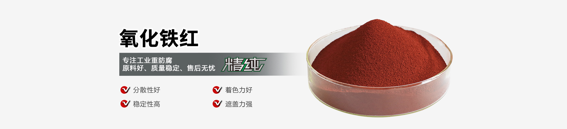 氧化鐵紅又稱鐵氧紅、鐵丹、銹紅,為橙紅至紫紅色的三方晶系粉末。分散性好,在漆膜中具有很好的封閉性和耐候性,著色力和遮蓋力很強(qiáng)。漆膜的穩(wěn)定性和機(jī)械強(qiáng)度高,防銹能力可大幅度提高。耐大氣影響,耐污濁氣體,耐一切堿類,無油滲性和水滲性,不溶于水,無毒、無臭、無異味,環(huán)保、安全雙重保障。主要用于建材工業(yè)、塑料制品、涂料著色、精磨材料。