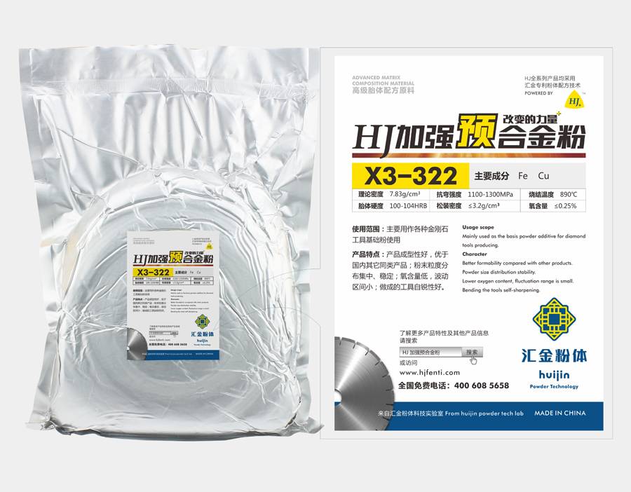 X3-322,HJ加強預合金粉系列產品之一,主要用作各種金剛石工具基礎粉末使用,產品主要為金屬元素Fe、Cu、B。產品做成的工具具有良好的自銳性。