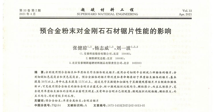 2021年4月10日,張健瓊、楊志威、劉一波等專家學者在超硬材料行業聞名期刊《超硬材料工程》第33卷第2期發表了《預合金粉末對金剛石石材鋸片性能的影響》一文。